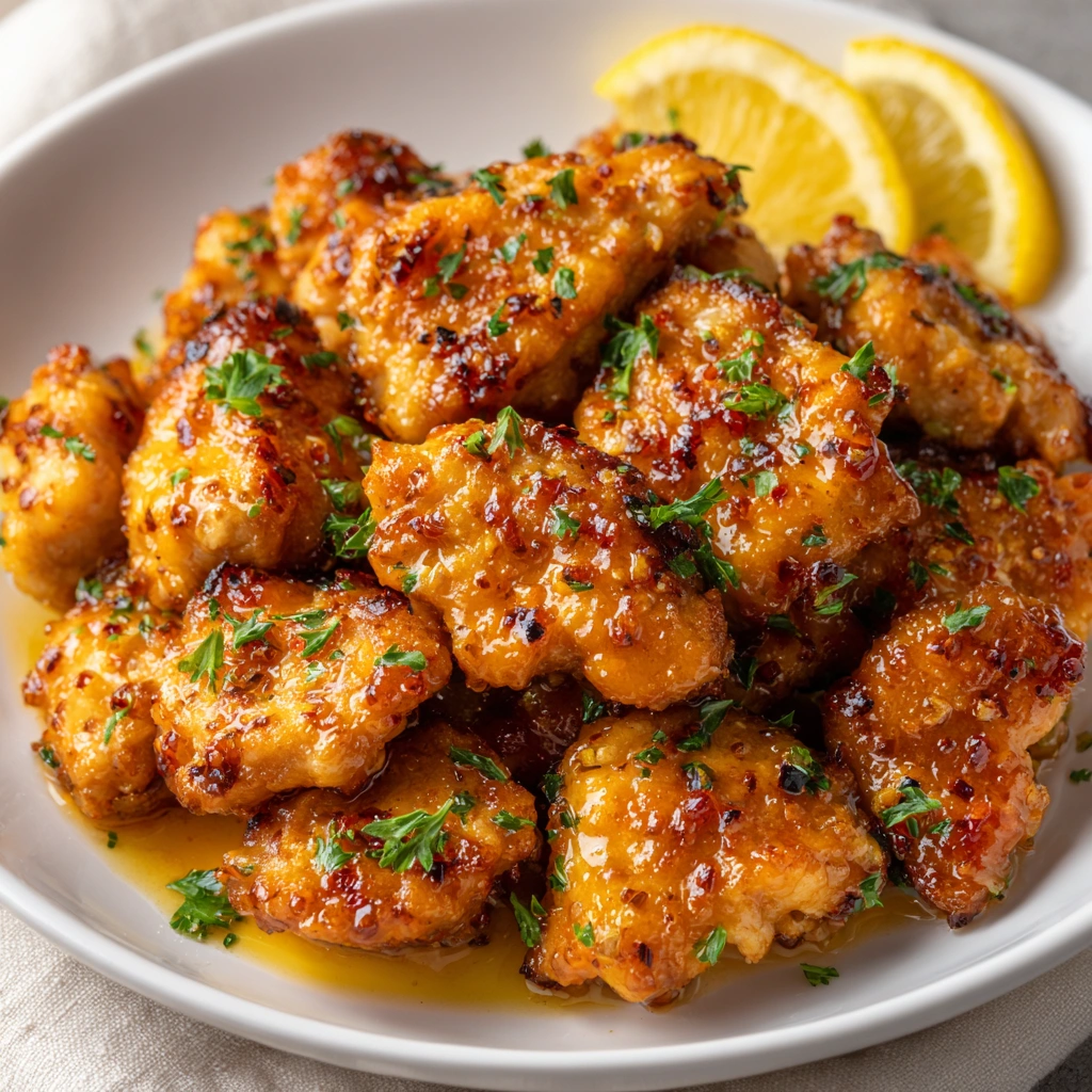 Crispy chicken chunks tossed in lemon garlic seasoning on a plate.
